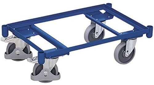 Acél szállítókocsi rakodófelület nélkül, 600 x 400 mm méretű műanyag ládákhoz alkalmas. Négy forgókerék, melyek közül kettő fékkel van felszerelve. Szürke, nyommentes, termoplasztikus gumi kerekek műanyag felnin, precíziós golyóscsapágyakkal, lábvédelemmel.