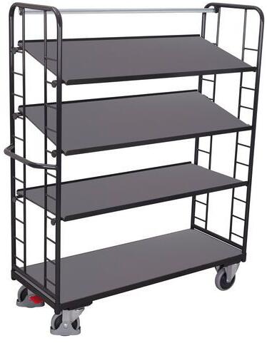 Anyagok és tárgyak szállítására alkalmas, négy polcos kocsi MDF lemezből. A felső, 15°-os dőlésszögű, állítható magasságú polcok 12 cm-es lépésekben állíthatók. Könnyű kezelhetőség fém fogantyúval. A mozgást négy gördülő golyóscsapágyas kerék biztosítja, amelyek közül kettő fix, kettő pedig forgó, fékekkel és védőburkolatokkal. A teherautó TUV tanúsítvánnyal rendelkezik.