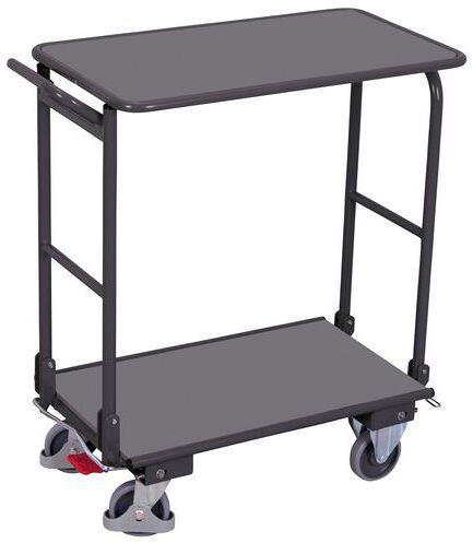 Összecsukható polcos kocsi acél szerkezettel. MDF lapból készült ágy. Két fix és két forgó kerék EasySTOP fékkel. Szürke, nyommentes, termoplasztikus gumi kerekek műanyag felnin, precíziós golyóscsapágyakkal, lábvédelemmel.