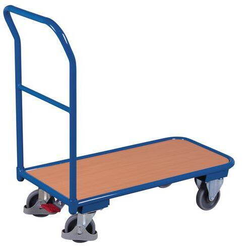 Acél platós kocsi fix fogantyúval. Ágyfelület bükk MDF lapból. Rakodási magasság 220 mm. Szürke, nyommentes, termoplasztikus gumi kerekek műanyag felnin, precíziós golyóscsapágyakkal. Két fix és két forgó kerék EasySTOP fékkel.
