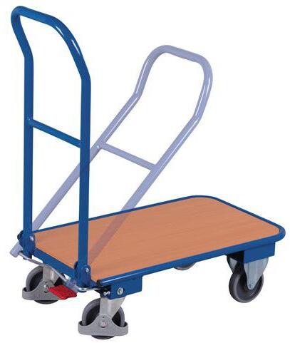 Összecsukható fogantyúval ellátott platós kocsik MDF lapból készült ágy. Rakodási magasság 265 mm. 2 fix és 2 forgó kerék EasySTOP fékkel. Szürke, nyommentes, termoplasztikus gumi kerekek műanyag felnin, precíziós golyóscsapágyakkal.
