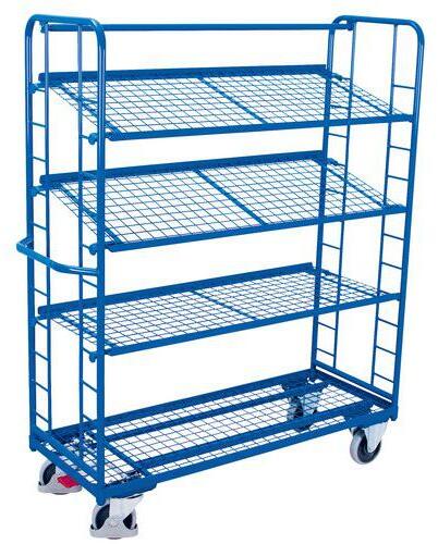 Fix alsó polccal és 3 változtatható hálós polccal ellátott kocsi. Polcok hálómérete 50 x 50 mm, lejtésszög 15°, élmagasság 15 mm. Polcrögzítési távolság 120 mm. Fogantyú a kocsi elején. 2 fix és 2 forgó kerék EasySTOP fékkel. Szürke, nyommentes, termoplasztikus gumi kerekek műanyag felnin, precíziós golyóscsapágyakkal.