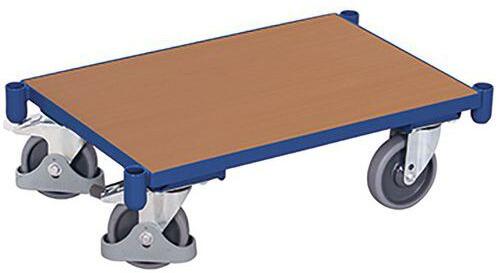 Szállítóplatform 600 x 400 mm méretű ládák elhelyezésére. MDF ágyfelület, egy síkban a vázzal. Négy forgókerék, melyek közül kettő fékkel van felszerelve. Szürke, nyommentes, termoplasztikus gumi kerekek műanyag felnin, precíziós golyóscsapágyakkal, lábvédelemmel.